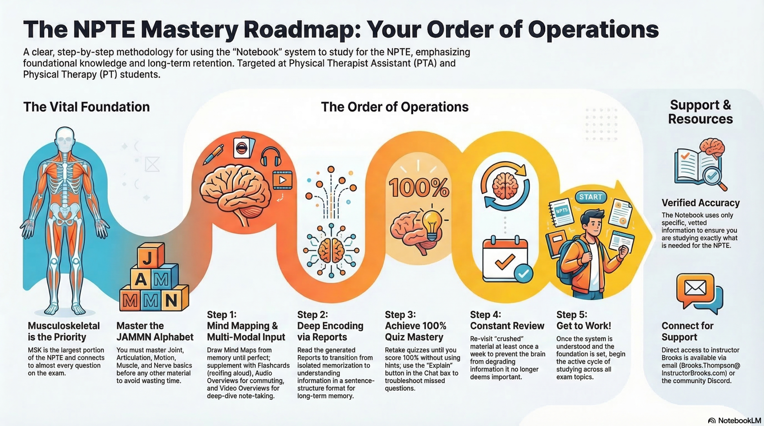 - "Instructor Brooks’ NPTE prep course was a game-changer for me. The way he breaks down complex topics into clear, digestible steps made studying so much less overwhelming. His strategies for test-taking, combined with targeted practice exams, gave me the confidence to walk into the exam knowing exactly what to expect. The Google Docs calendar was a huge help in keeping everything organized and making sure I stayed on track—it took the guesswork out of what to study and when."